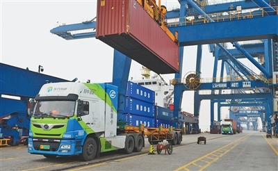 加快发展方式绿色转型 浙江嘉兴立足氢能源领域资源优势,持续拓展氢能示范“应用链”。图为嘉兴港乍浦港区,氢能重卡在集装箱码头运输作业。 本报记者 陈 斌摄 |