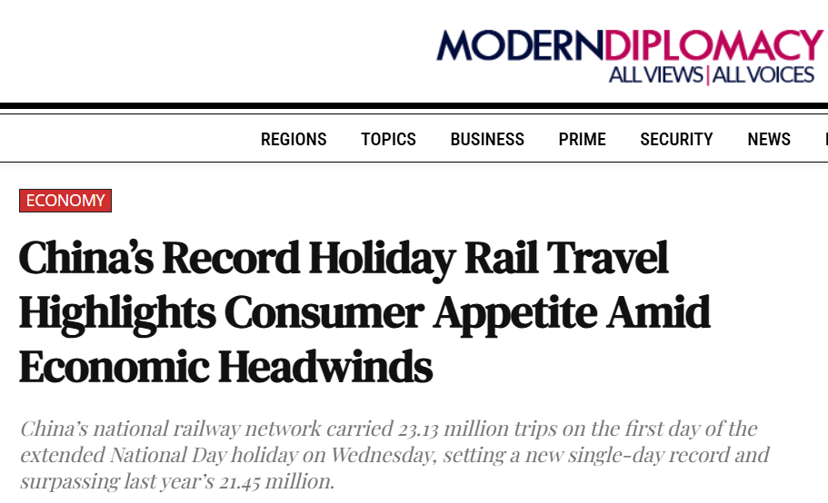 欧洲《现代外交》(Modern Diplomacy)网站报道注意到,中国国庆中秋“超长黄金周”首日,全国铁路发送旅客2313万人次,创下单日历史新高。报道援引官方预测称,整个八天假期出行总量预计将达23.6亿人次,日均出行近3亿人,堪称“史上最忙假期”。