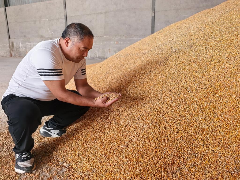 2025年10月10日,在安徽省宿州市萧县刘套镇,三大家村党总支书记高杰查看刚烘好的玉米。新华社记者 水金辰 摄