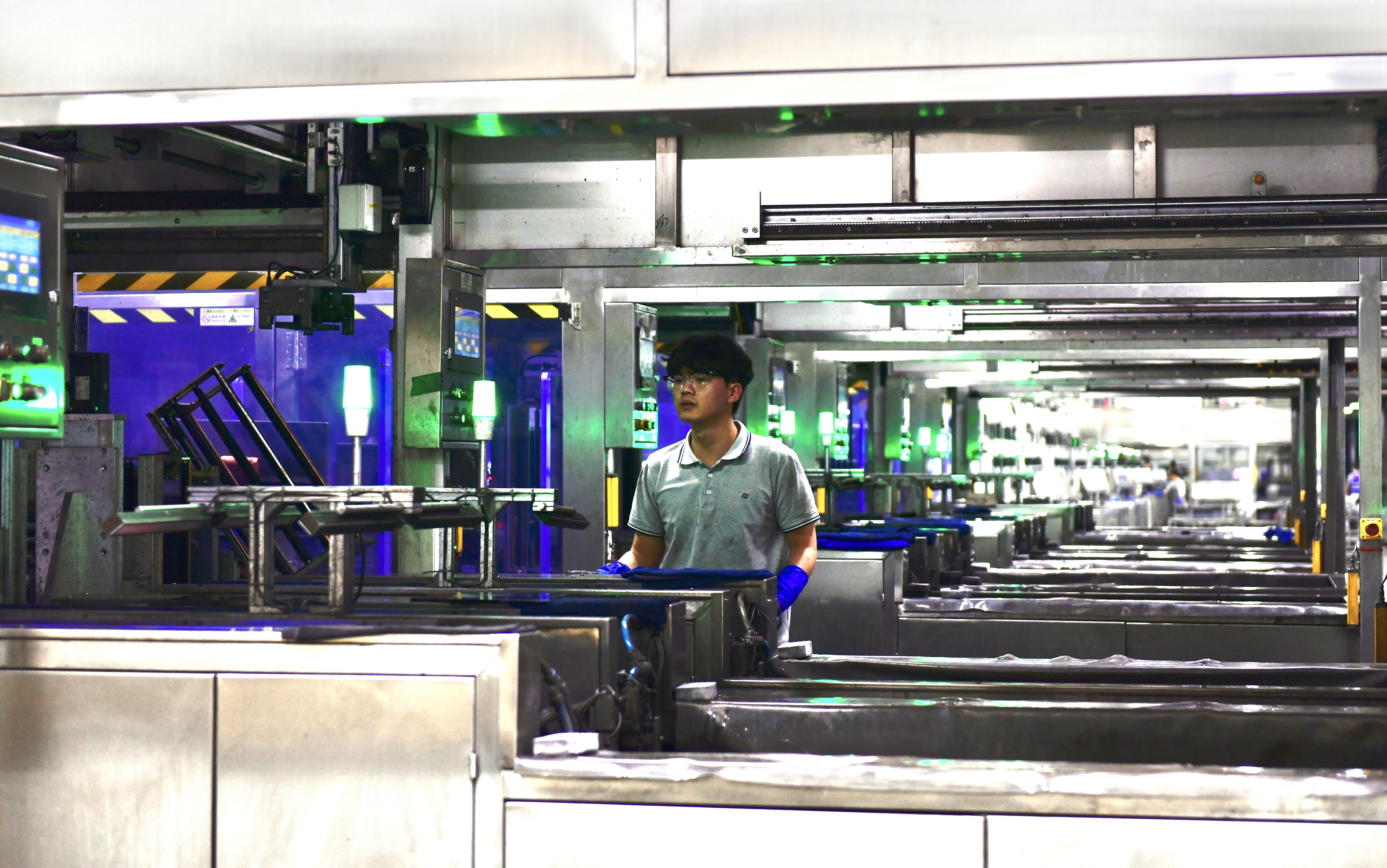 AGV小车如精灵般在智能车间流畅穿梭,机械臂在空中划出优雅弧线,薄如蝉翼的硅片在设备间完成着光的“魔术”……10月30日,记者随“活力中国调研行”采访团来到徐州经开区弘元新材料(徐州)有限公司,仿佛置身于一个充满未来感的光电世界。