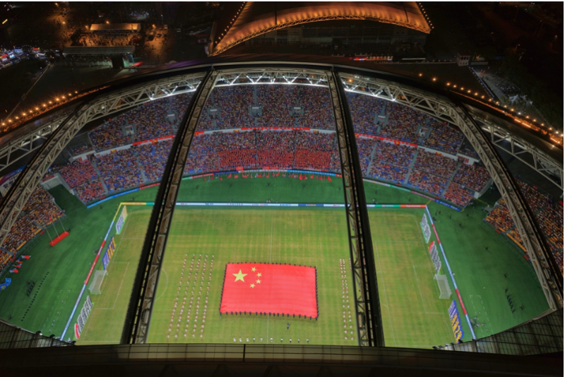 10月7日,“苏超”淘汰赛1/4决赛南通主场对阵淮安,南通体育会展中心顶盖打开。许丛军摄
