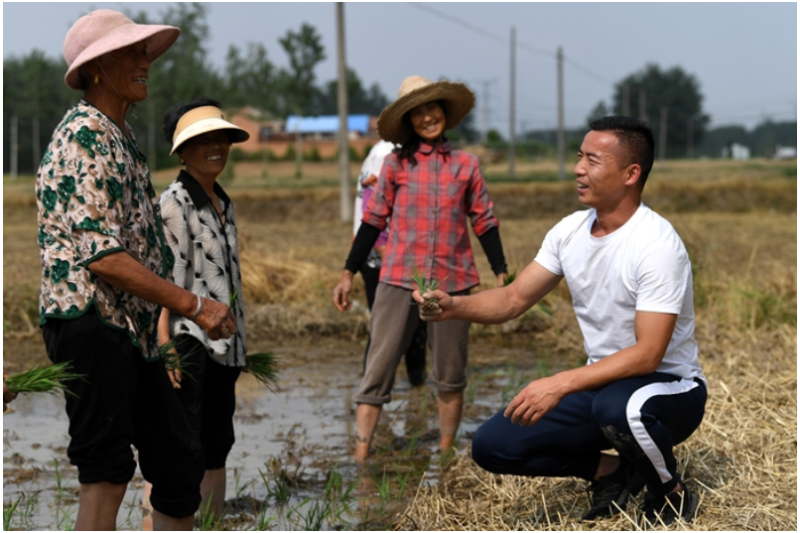 “三夏”时节戴虎在田间与村民们交流。受访者供图