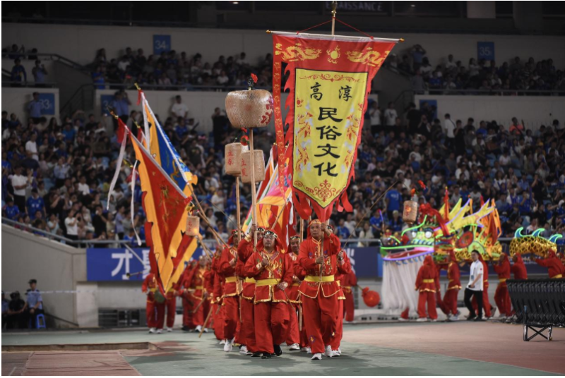 “苏超”淘汰赛1/4决赛南京主场对阵连云港,赛前举行当地民俗文化展演。刘建民摄
