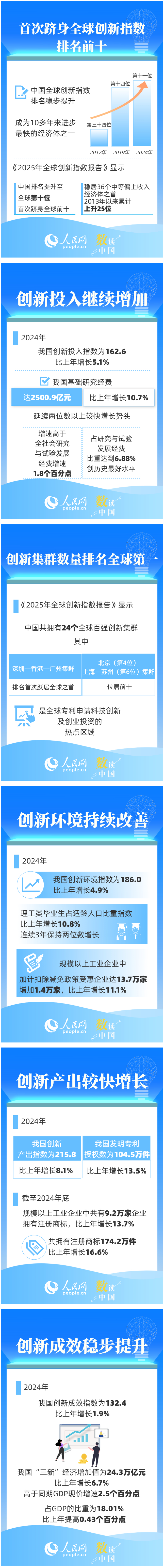 世界知识产权组织(WIPO)发布的《2025年全球创新指数报告》显示,中国排名提升至全球第10位,首次跻身全球前十;国家统计局日前发布2024年中国创新指数测算结果,2024年中国创新指数达到174.2,保持稳步增长态势。中国跑出创新“加速度”,一组数据来看。