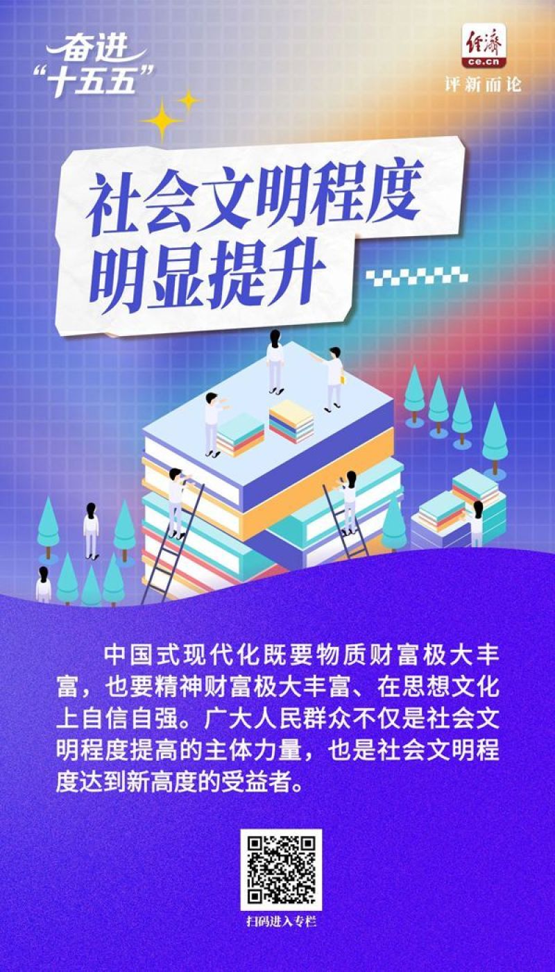 社会文明程度明显提升不是一个抽象目标,而是有着具体鲜活的指向,需要落实到实践中。如今,人民群众的文化需求日益多样化、个性化。从“提升文化原创能力”“繁荣互联网条件下新大众文艺”“推进书香社会建设”,到“实施积极的文化经济政策”“发展新型文化业态”“引导规范网络文学、网络游戏、网络视听等健康发展”……聚焦新形势新需要,“十五五”规划建议提出一系列新举措,绘制出文化发展的新图景。