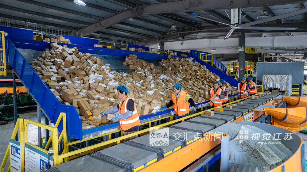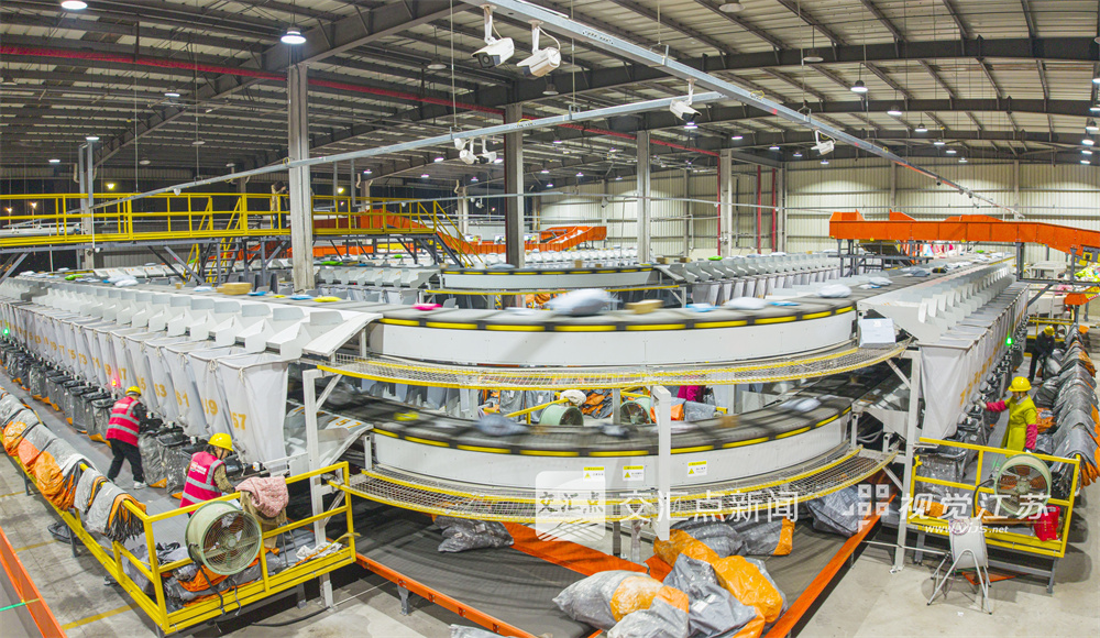 11月10 日,在中国邮政速递物流股份有限公司兴化邮政分公司转运中心,工作人员在智能快递流水线上分拣快递邮件。周社根 摄 视觉江苏网供图