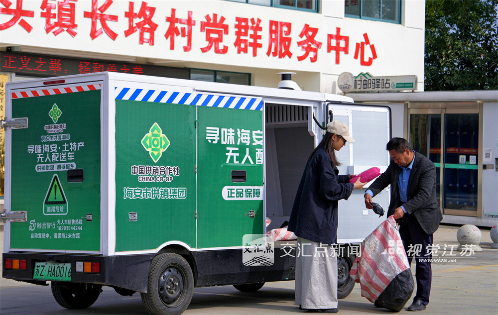 11月10日,在海安市墩头镇长垎村,村邮驿站工作人员正从无人快递配送车上卸下邮件。周强 摄 视觉江苏网供图