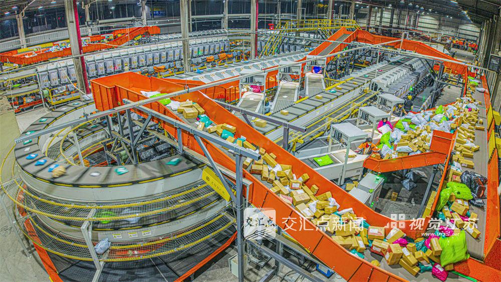 11月7日,宿迁市宿城区申通快递分拨中心灯火通明,工作人员在智能分拣流水线上分拣快递包裹,一派繁忙景象。徐江海 摄 视觉江苏网供图