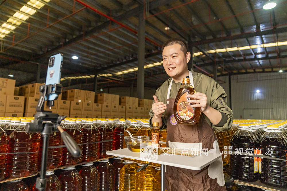 10月28日,海安市孙庄街道一家粮油食品企业的销售人员正在直播销售食用油。翟伟凯 摄 视觉江苏网供图