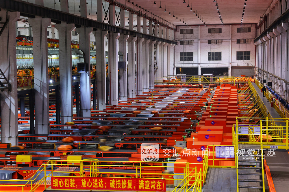 11月7日,位于无锡市惠山区的圆通无锡转运中心车间里热火朝天,工作人员正在进行分拣、打包、装车等作业,积极备战“双十一”,保障物流供应链高效畅通。钦嫣 摄 视觉江苏网供图