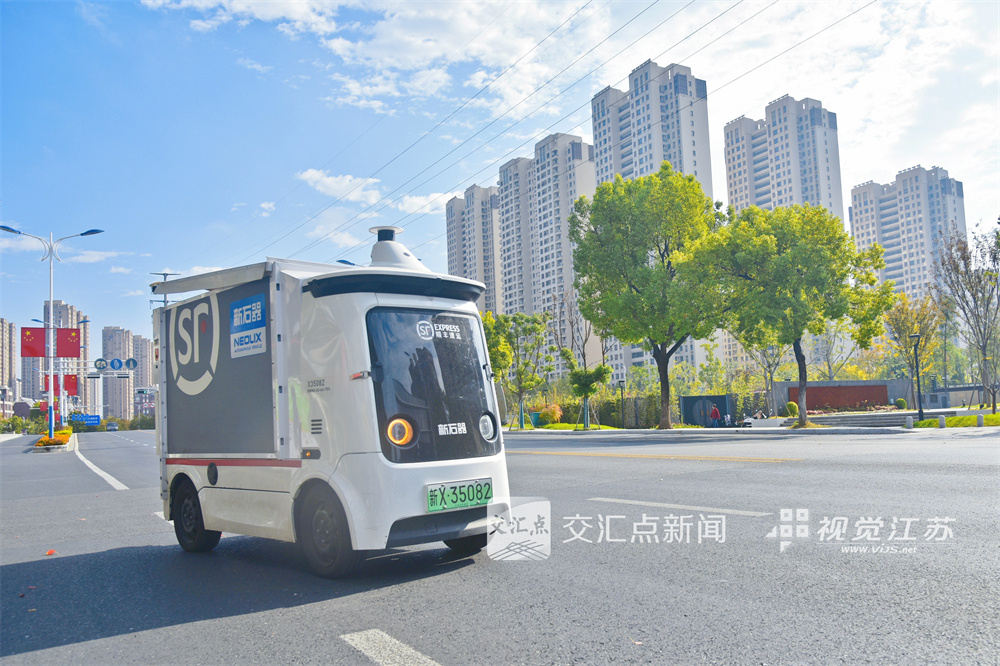 2025年11月6日,在如皋市如城街道福寿东路上,一辆智能无人快递配送车驶向快递驿站。吴树建 摄 视觉江苏网供图