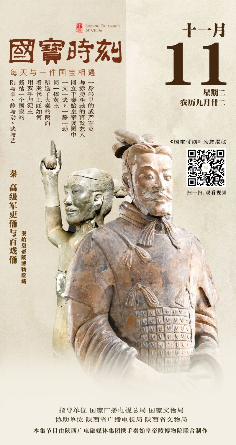 一身彩甲的威严军吏与赤膊生动的百戏艺人,同立于秦始皇帝陵园中。一文一武,一静一动,同一捧黄土,塑造了大秦的两面。看秦代工匠如何用双手与泥土,凝结一个国家的刚与柔、静与动、武与艺。今天由陕西广电融媒体集团中国•考古工作室精心制作的《国宝时刻· 高级军吏俑与百戏俑》为您揭秘!