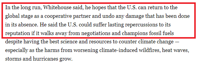 怀特豪斯表示,从长远来看,他希望美国能够以合作伙伴的身份重返全球舞台,弥补其缺席期间造成的损害。他指出,如果美国明明拥有应对气候变化的最好的科学技术和资源,却仍然退出《巴黎协定》,积极支持化石燃料,这些行为将长久地损害其声誉——尤其是在全球气候变化引发的野火、热浪、风暴和飓风等灾害日益加剧的情况下。“我们越快做出正确的抉择,越好。”他说。