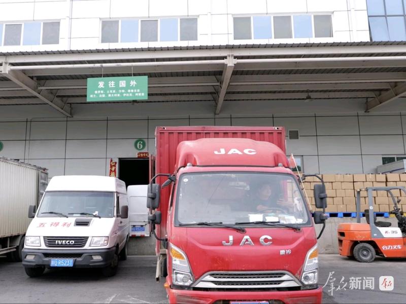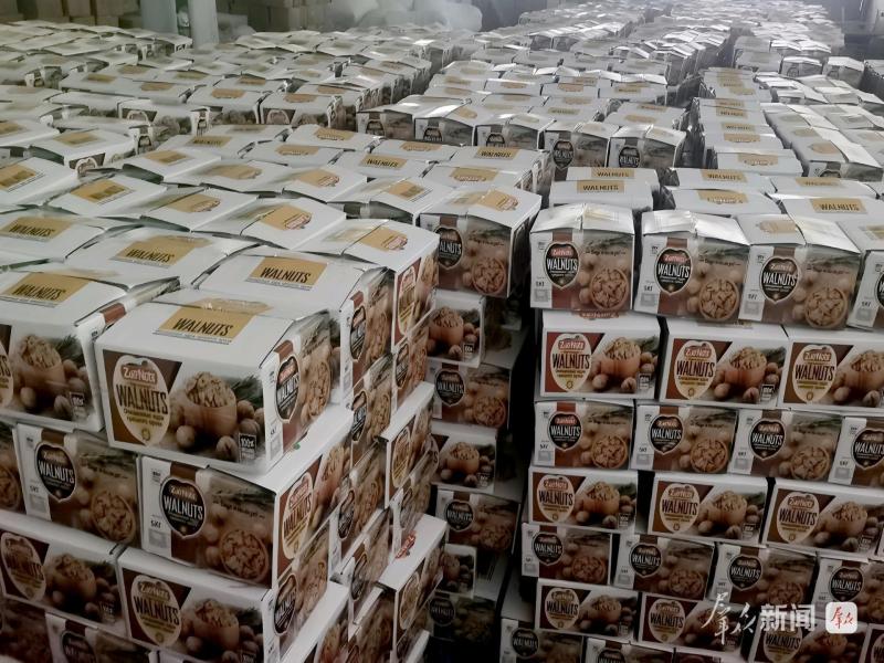 10月11日,记者在西北核桃物流园内看到,成堆的优质核桃仁在园区装箱,货箱旁的立牌上标注着销售地,一部分发往国内市场,一部分发往俄罗斯、土耳其等国家和地区。