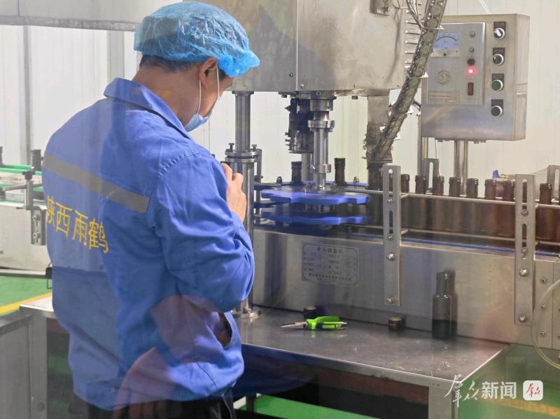 10月10日,在陕西雨鹤生物科技有限公司生产车间,工人全神贯注盯着灌装生产线上的核桃油。“公司以高端食用油产业化经营为主,拥有压榨、精炼、全自动化灌装生产线。”杨刚平介绍,“用于生产核桃油的核桃主要是洛南本地的老树核桃。洛南核桃经常不够用,我们还从新疆等地收购。”