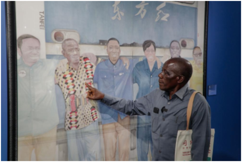 老人抬手指向另一幅画——画中的几个坦桑工人站在“东方红”机车旁,笑容爽朗。姆瓦卡桑加看着画里的人,眼眶微微泛红。这时,又有几位老工人靠了过来,彼此交换着只有他们听得懂的回忆。