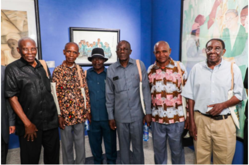 11月26日,在坦桑尼亚达累斯萨拉姆,坦赞铁路退休职工在“同路朋友——坦赞铁路采风绘画展”上合影。新华社发(赫尔曼·埃马纽埃尔摄)
