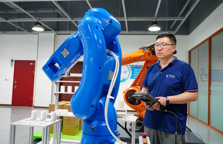 在位于龙口市的龙牙智能生产车间里,工作人员在检测一台工业机器人(7月2日摄)。新华社记者 徐速绘 摄