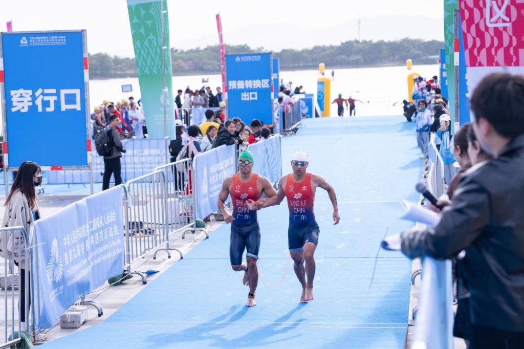 ↑11月27日,广东一团选手石金飞(中)与引导员杨奥富在跑步比赛中冲刺