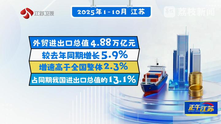 从高端装备制造企业“布局”海外,到港口物流的链上赋能,一个个鲜活出口案例,正是江苏外贸韧性的生动注脚。在对外贸易环境不确定性较大的背景下,江苏外贸稳中有进、逆势突围。据南京海关统计,今年前10个月,江苏省外贸进出口总值4.88万亿元,较去年同期增长5.9%,增速高于全国整体2.3个百分点,占同期我国进出口总值的13.1%。