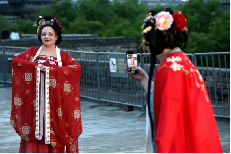 两位外国游客身着唐朝服饰拍照