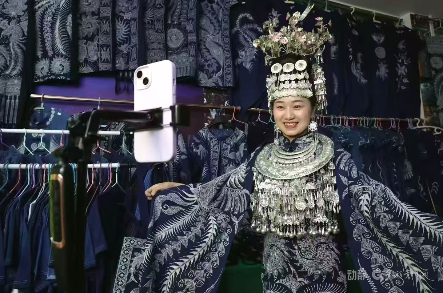 每次外出推介时,刘勤兰都要穿上百鸟衣。她说,希望让更多的人看到苗族服饰之美。“穿着百鸟衣,戴着漂亮的头饰,走到哪里叮叮当当的响,很多人就过来给我拍照。我就要做个‘显眼包’,这样才能慢慢地做成自己的IP,做成自己的一个品牌。”