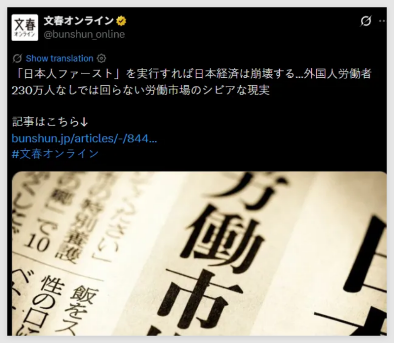 然而,常年研究日本外籍劳动者话题的纪实作家安田峰俊认为,如果日本真的推行“日本人优先”的政策,将外籍劳工赶出日本,那么日本的经济将崩溃。