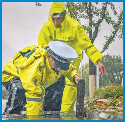浙江省湖州市长兴县公安局民辅警冒着强降雨疏通排水口。 方金华摄(影像中国) |