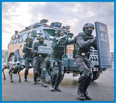 四川省绵阳市公安局特巡警支队特警大队队员与警用机器狗协同配合,开展实战化演练。 唐 超摄(影像中国) |
