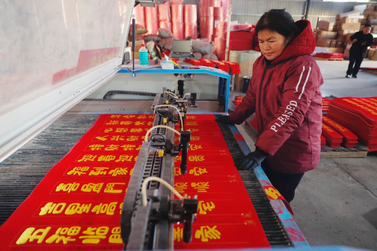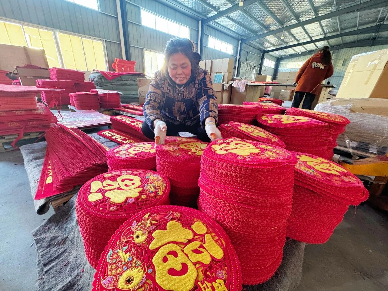 “春节临近订单量翻倍,我们现在开足马力赶生产,全力保障苏皖鲁等地节日市场供应。”宏泰喜庆制品厂生产负责人谢宝珠介绍道。工厂以生产春联、福字、灯笼等新春喜庆用品为主打产品,凭借款式多样、做工扎实的优势,已成功深耕苏皖鲁市场多年,成为区域内重要的节日喜庆用品供应基地。她自豪地说:“我们不仅要做好的产品,更要让这份浓浓的年味传遍大江南北。”