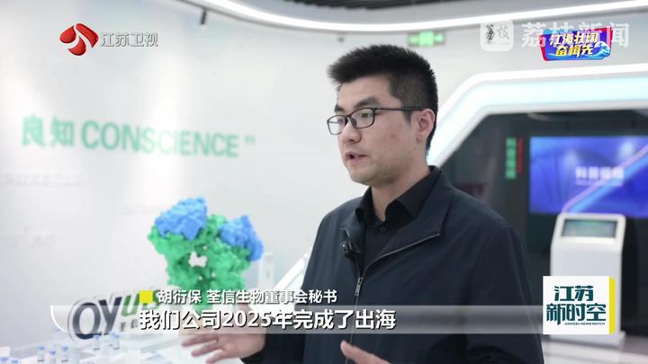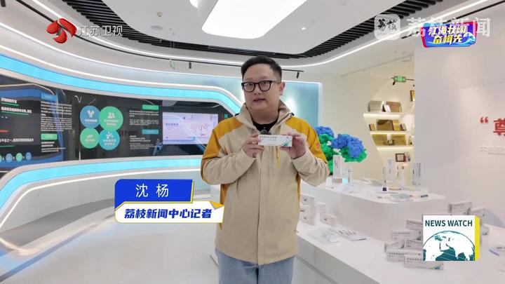 荔枝新闻中心记者沈杨说:“这里是位于泰州中国医药城的荃信生物,我手上这盒注射剂是企业耗费十年时间研发成功的首个上市药品,主要用于治疗银屑病,更是打破了我国在该领域进口依赖。在中国医药城,像荃信生物这样经过时间沉淀迎来‘爆发期’的企业不在少数。”