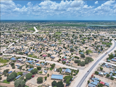 “村村通”项目致力于打通偏远村庄至城镇主干道的“最后一公里”。图为“村村通”项目在纳米比亚实施后,伦杜市图欣吉雷尼村修建了与主干道连通的村道(无人机照片)。