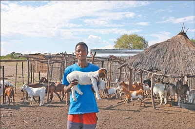 “村村通”项目的实施助力伦杜市姆博拉村畜牧业发展。图为在姆博拉村,村民卡西安展示自己饲养的小羊。