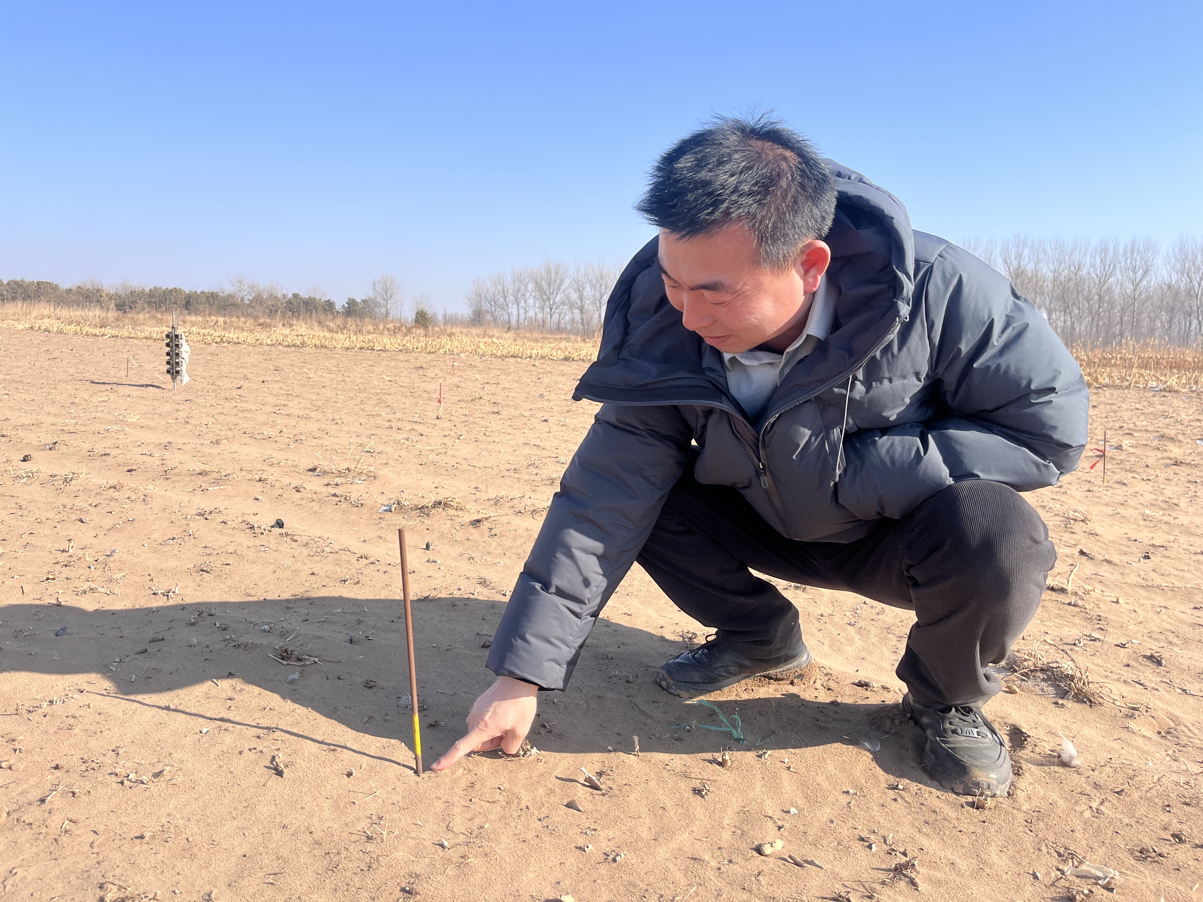试验田里还竖立着多根一厘米粗细、带有黄色标识的铁棍。在冬黑麦田里,铁棍标记地面高度基本没有改变,在没有种植冬黑麦的区域被风蚀2厘米不止。“经过测算,种植冬黑麦,每亩地每年可减少沙土风蚀量43立方米。”吕林有说。