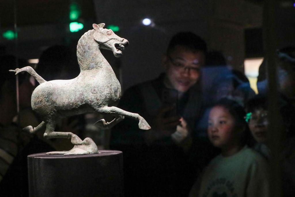 2026年1月26日晚,在甘肃省博物馆二楼丝绸之路文明展厅,观众观看铜奔马(复制品)。新华社记者 郎兵兵 摄