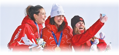自由式滑雪女子坡面障碍技巧决赛后,亚军中国队选手谷爱凌(左)和冠军、季军合影。 新华社记者 张宏祥摄 |