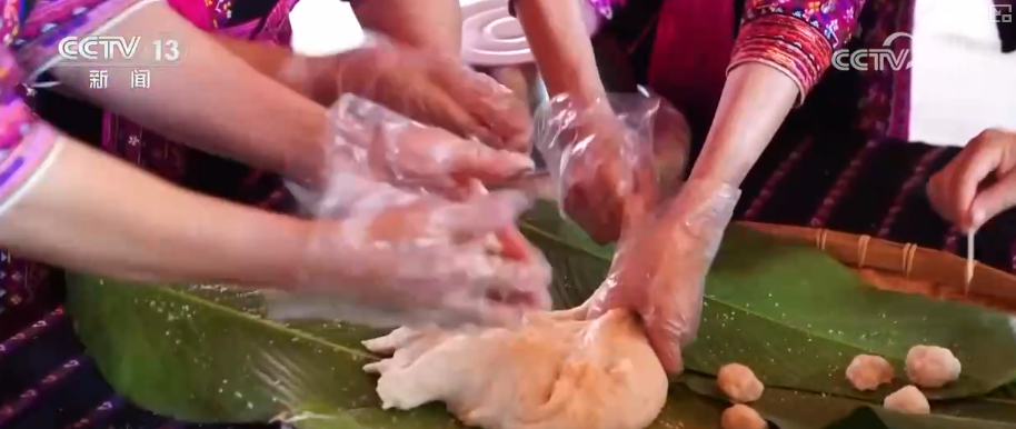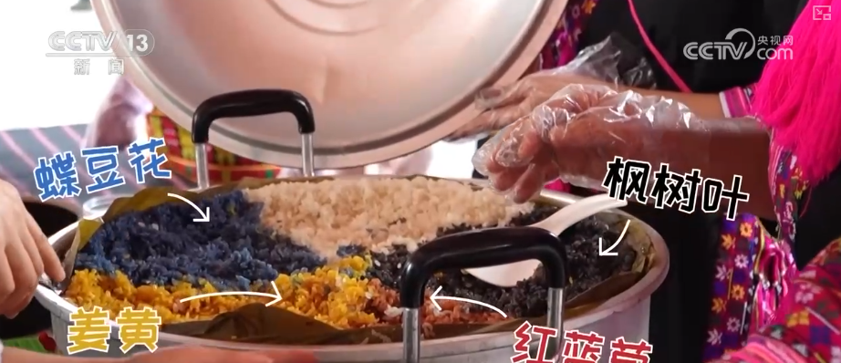 工作人员盘昕介绍,五色饭就是由4种不同植物染制而成的,吃起来有点甘甜,淡淡的甜味。寓意着五谷丰登、团圆美满。
