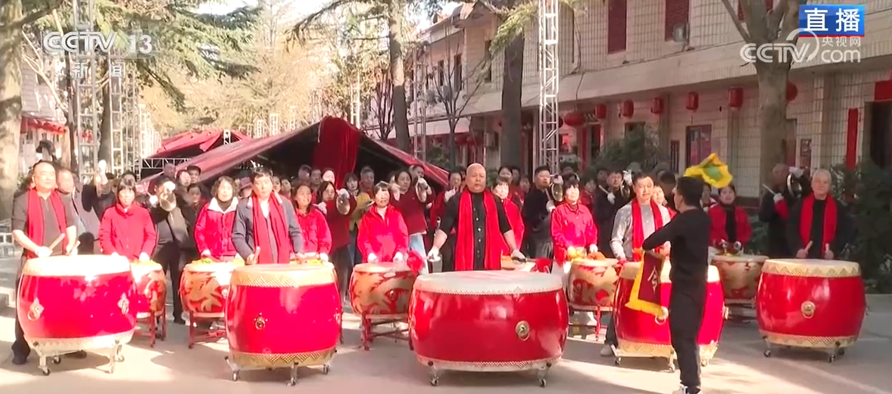 总台记者 张恩雨:此刻,我是在袁家村的村口,同时也是村里百人锣鼓队表演的现场。在陕西关中农村地区,每年过年每个村子都会有这样的锣鼓表演,村民们告诉我,“锣鼓声一响,年就到了。”大家可以看到,我身后的锣鼓队队员们是激情昂扬、气势如虹。这些铿锵有力的鼓点,正是关中地区非常有名的曲目《秦汉战鼓》,没有繁复的花腔,而是重在力量和气势。特别值得一提的是,这支队伍里年龄最大的已经75岁,最小的只有26岁,而且所有人都是零基础的村民,仅仅集中学习了10来天,就呈现出了今天这样的气势。