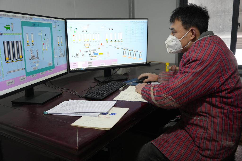 工作人员正在检查饲料自动喂养系统。新华社记者 田金文 摄