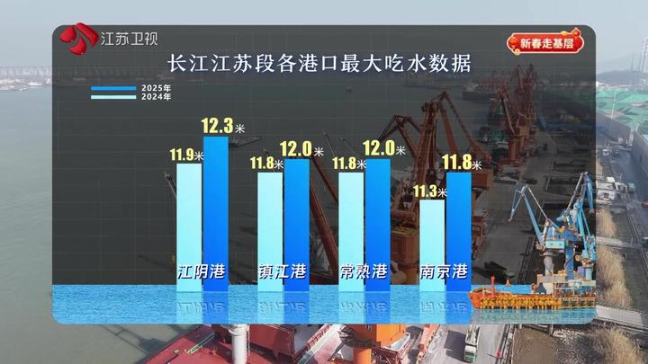 在引航员的精准指令下,四艘拖轮陆续贴靠在这艘长达299米的开普船旁,调整角度,制动减速,缓缓将巨轮推送入港。巨轮能“直靠”,背后是航道能级实打实的跃升。过去一年,长江江苏段开展“深水攻坚”,江阴港、镇江港、常熟港、南京港等最大吃水全部刷新,为重点船舶“直进直靠、直离直出”提供了条件。