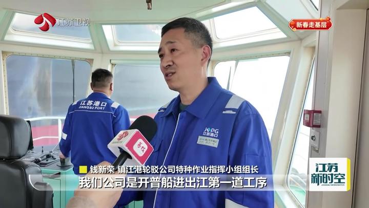 荔枝新闻中心记者徐华峰说:“我现在是在镇江港的一艘拖轮上,我身后的江面上,是一艘来自澳大利亚、运送10万吨铁矿石的开普型远洋轮船。这是今年靠泊镇江港的第11艘开普船。我们这次‘水运江苏’的体验采访,就从帮助这艘巨轮安全停靠码头开始。”