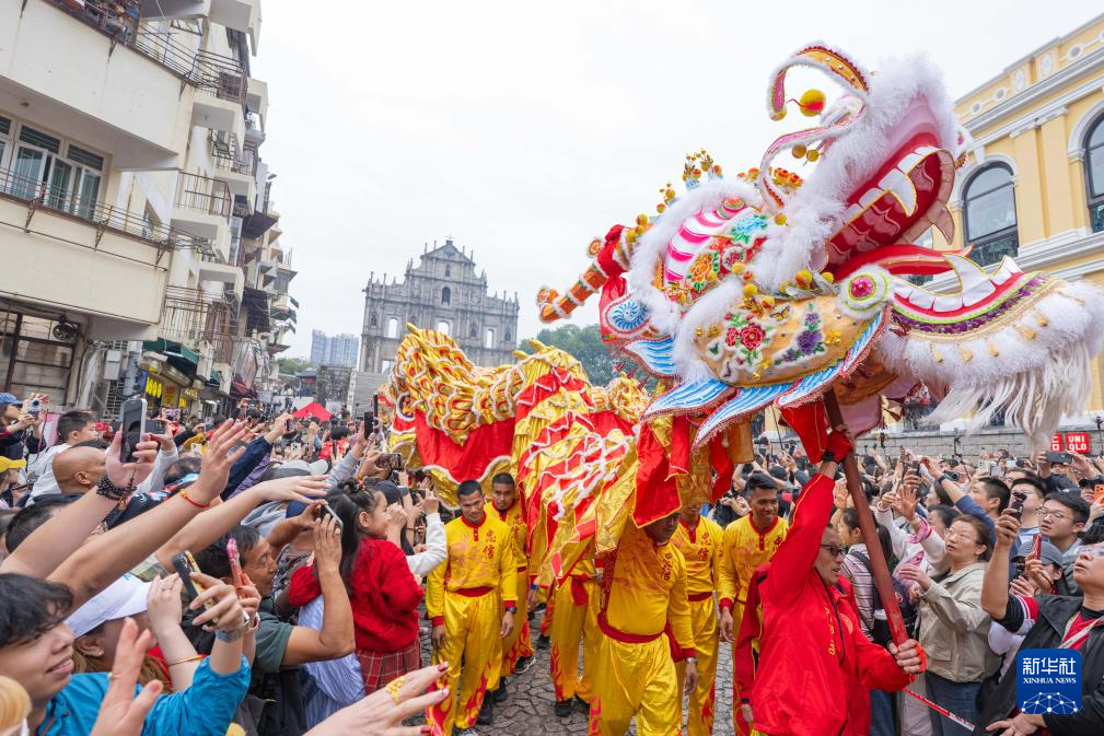 广东中山游客王世杰一早便在大三巴牌坊前等着金龙。“粤澳文化相近相通,都讲粤语、吃粤菜,都喜欢舞龙舞狮。”他说,舞龙醒狮同台献瑞的传统,把节日喜庆氛围“推向更高”。