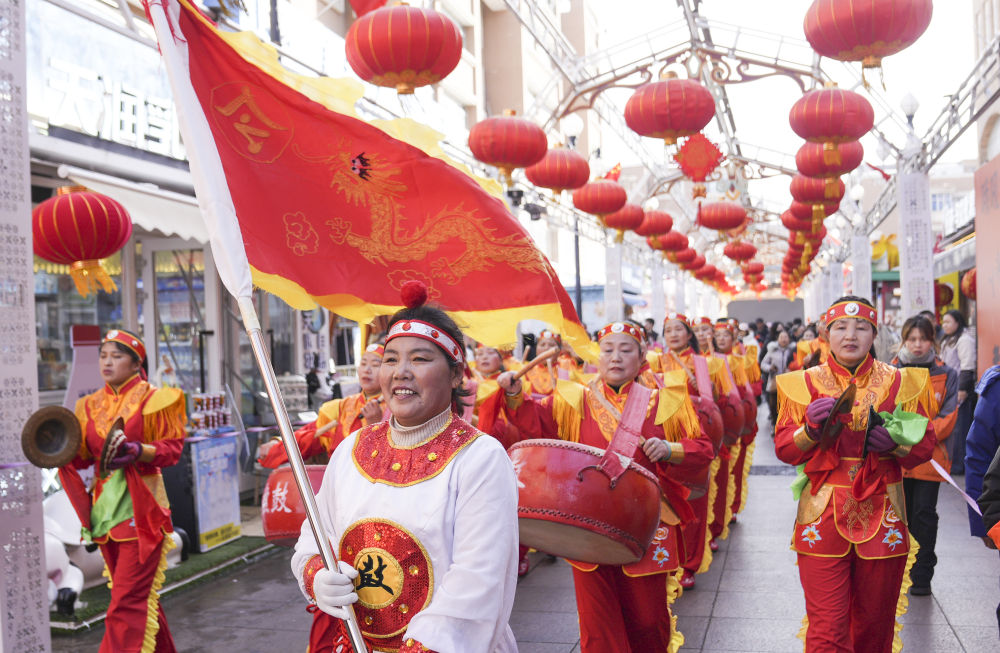 在新疆乌鲁木齐市水磨沟区,英歌舞表演队正在演出中(2月21日摄)。新华社发(李文武 摄)