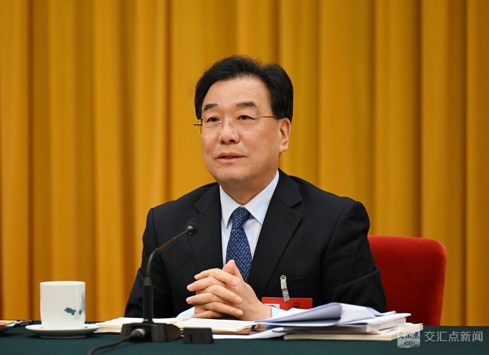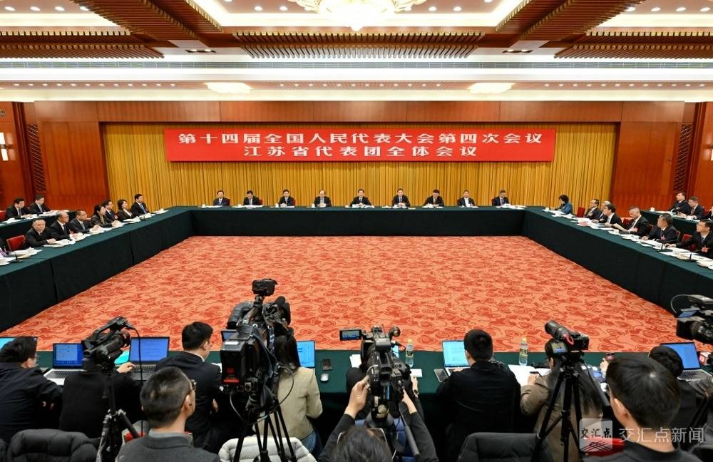 3月7日上午,人民大会堂二楼东大厅,十四届全国人大四次会议江苏代表团举行全体会议,审议政府工作报告,审查计划报告和草案、预算报告和草案。根据大会安排,本次全体会议向境内外记者开放。全国人大代表、省委书记、省人大常委会主任信长星回答了记者提问。全国人大代表、省委副书记、省长刘小涛主持会议并回答记者提问。商务部党组成员、部长助理袁晓明等到会听取代表审议意见。