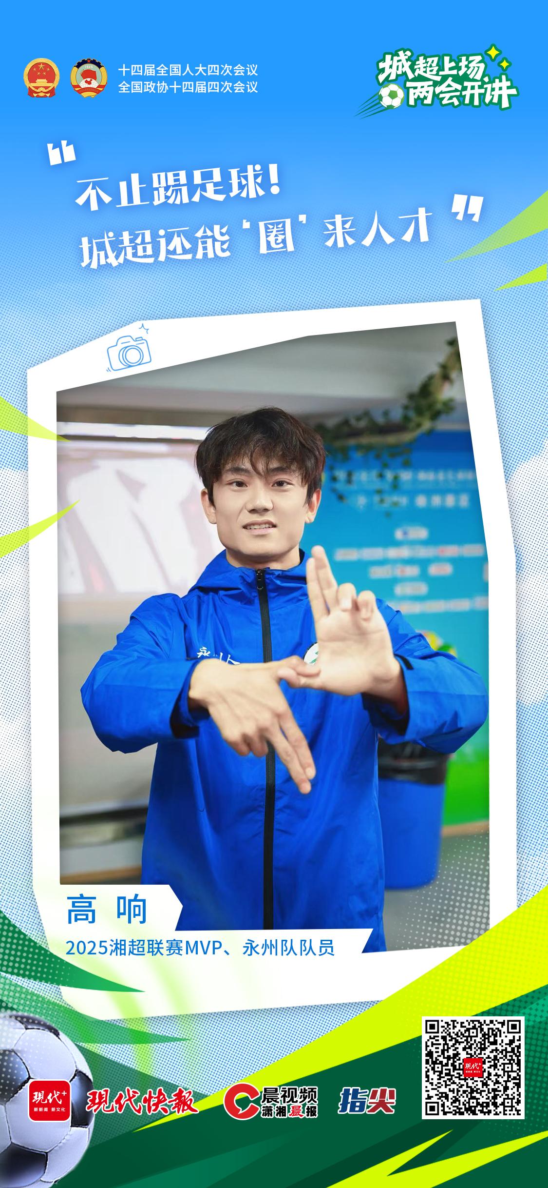 从万人空巷的赛场到深入人心的城市IP,湘超已成为湖南体育的一张亮眼名片。作为2025湘超联赛最耀眼的球员,永州队队员高响坦言,湘超最打动他的,是这片让普通球员绽放光芒的平台。