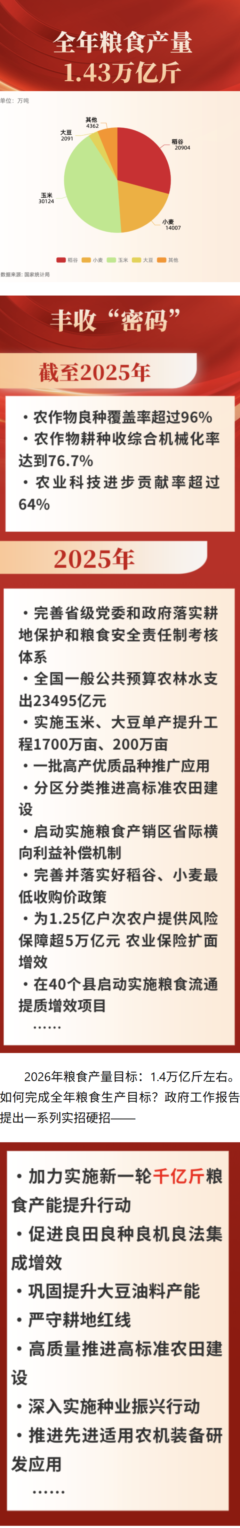 2026年3月5日提请十四届全国人大四次会议审议的政府工作报告显示,过去5年,粮食等重点领域安全能力建设明显加强。2025年,我国着力稳面积、提单产、抗灾害,再夺粮食丰收。