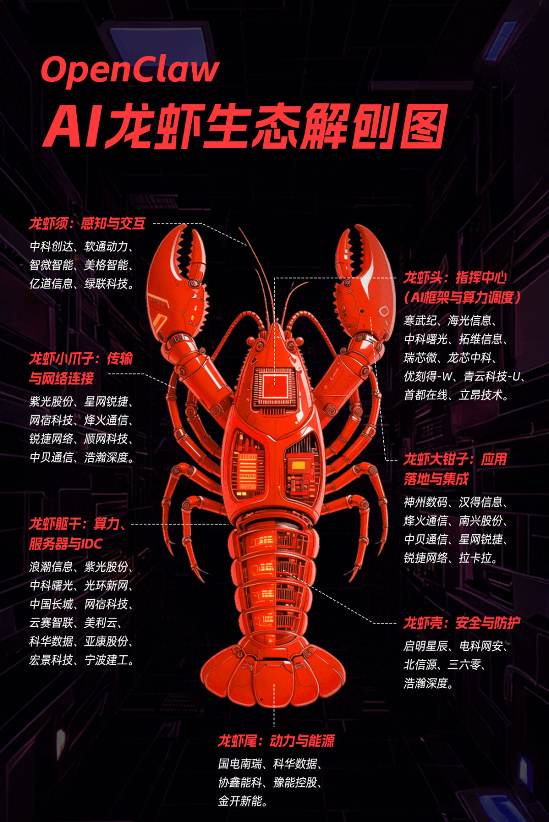 艾媒咨询指出,“AI养龙虾”产业链以OpenClaw开源框架为核心,将辐射至“龙虾头”(AI框架与算力调度)、“龙虾躯干”(算力、服务器与IDC)、“龙虾须”(感知与交互)、“龙虾大钳子”(应用落地与集成)、“龙虾小爪子”(传输与网络连接)、“龙虾壳”(安全与防护)、“龙虾尾”(动力与能源)等领域,预计2030年市场规模有望突破3000亿美元。