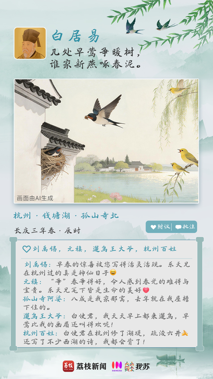唐朝长庆三年春,白居易任杭州刺史。他不仅留下政绩,造福百姓,还在西湖的春光中吟诵出不少经典诗篇。《钱塘湖春行》一诗中,孤山寺北,春水初涨,几处早莺争着飞往向阳的枝头,燕子飞来飞去,衔春泥筑新巢,好不热闹,无不透出诗人对春天乍到的惊喜。湖东的白沙堤,白居易走也走不够,字里行间满是对西湖春日的喜爱与陶醉。这条“朋友圈”,真是一点“班味”都没有。