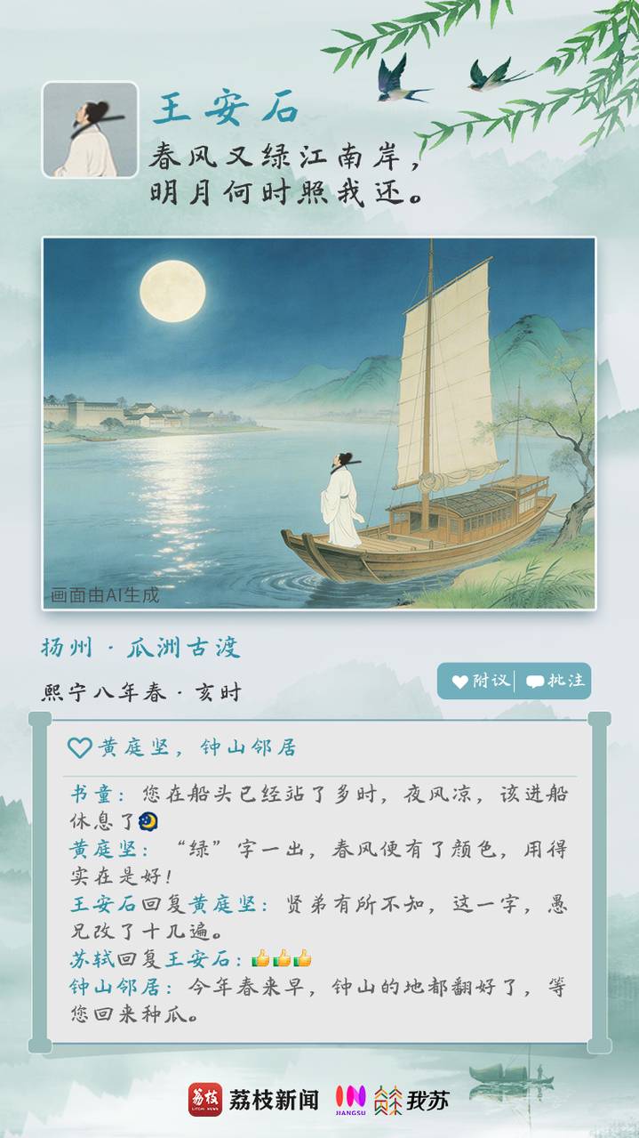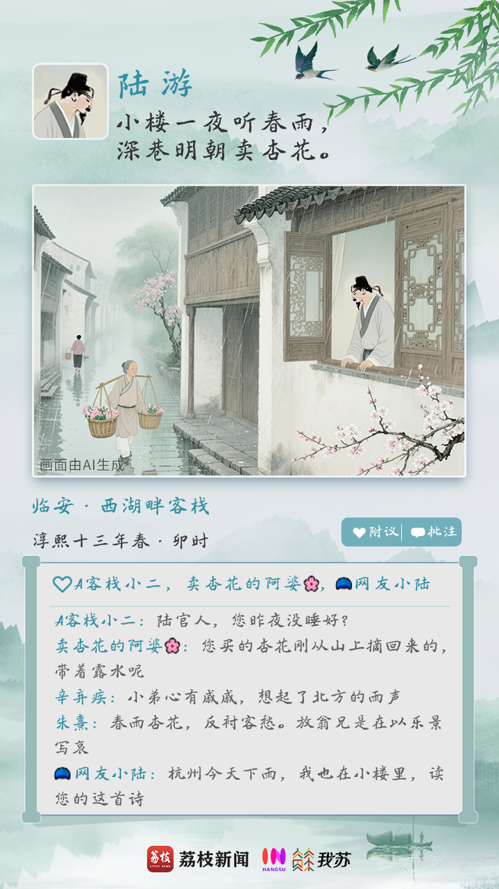 假如古人们也喜欢发朋友圈,这江南的春色定会展现出别样的诗情画意。春景无限,滋味万千。古人的春天里又藏着多少种思绪?今天,穿越古今,用AI将诗句具象化,在八位文坛大V的“朋友圈”里,感受一番他们笔下各不相同的春日心境。