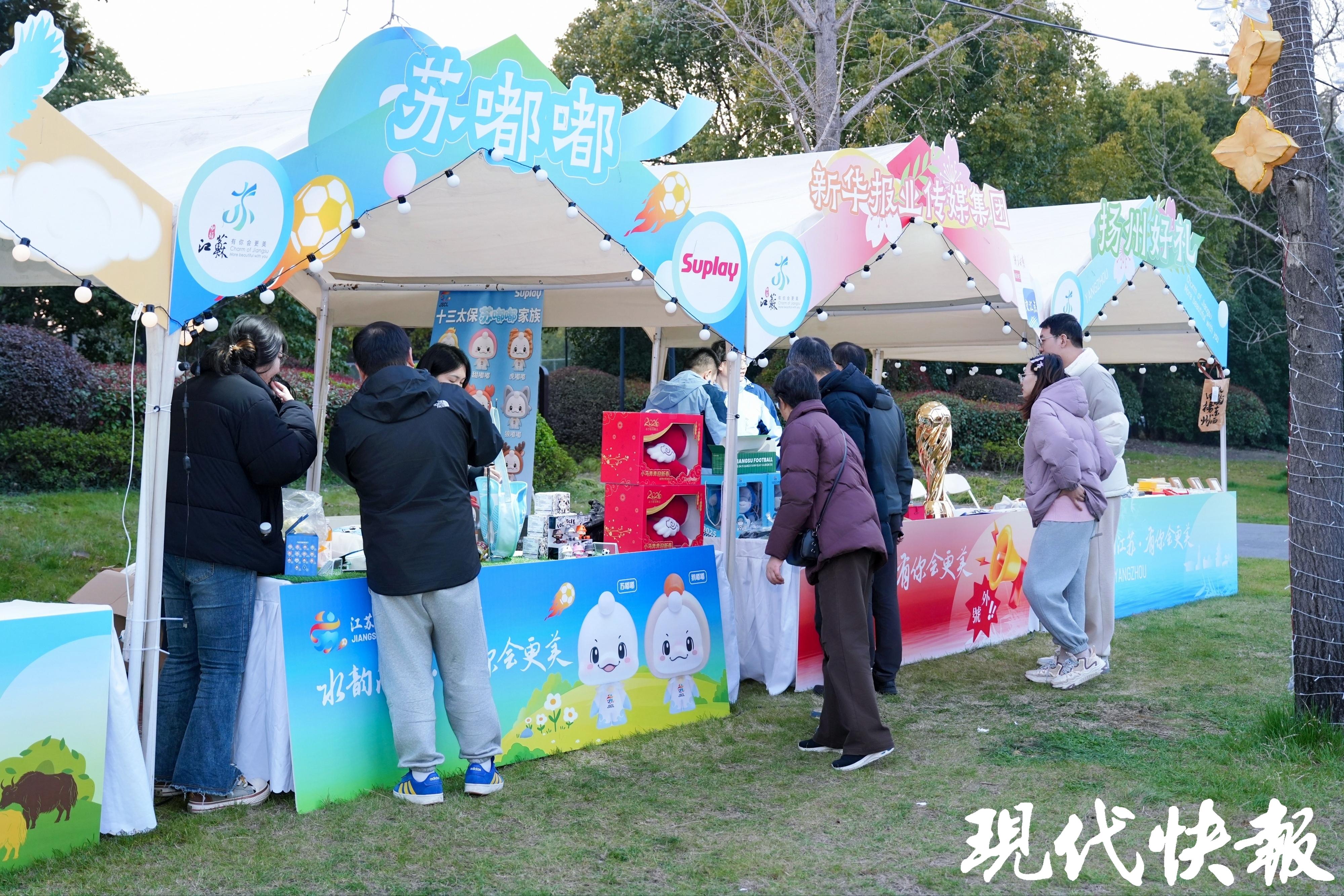 现场市集也分外热闹,13个设区市文旅都带来了特色文创,苏超吉祥物展台围满人,现场的工作人员介绍,苏超吉祥物盲盒一经推出就售罄了,正在紧急补货,预售价为69元/个。